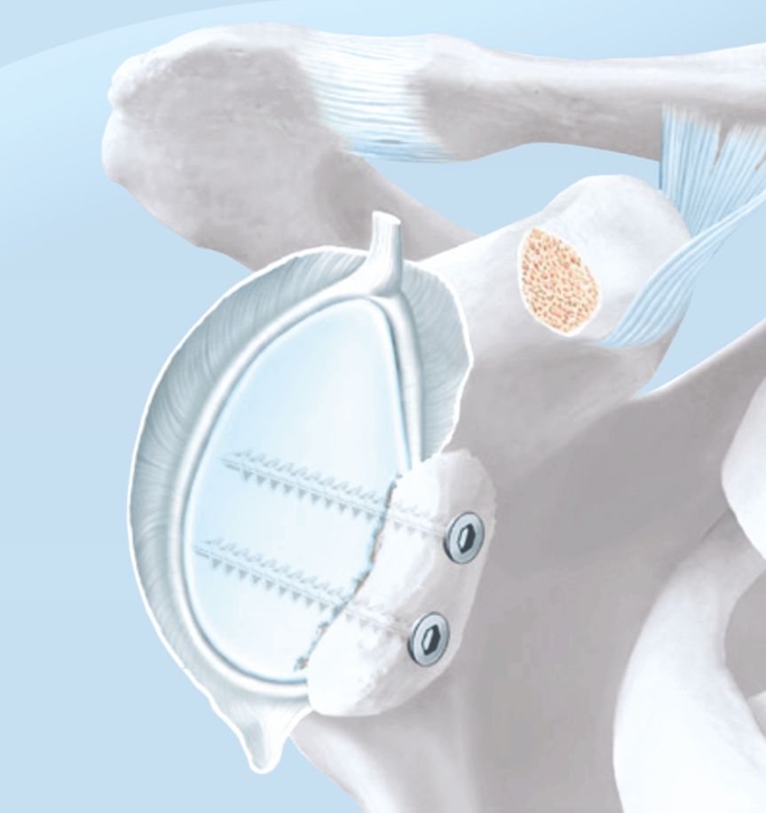 Bei der sogenannten Stabilisation nach Latarjet wird ein gelenknaher Knochenvorsprung (Coracoid) mitsamt anhängender Sehne auf den vorderen unteren Pfannenrand versetzt und dort mittels Schrauben fixiert, um den knöchernen Defekt auszugleichen.