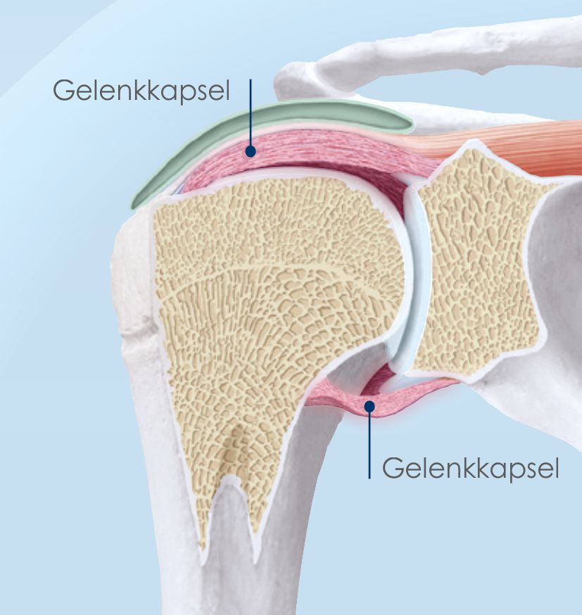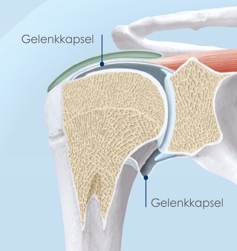 Das Schultergelenk wird von einer festen, bindegewebigen Kapsel umhüllt. Diese Kapsel sorgt für Stabilität und produziert eine Schmierflüssigkeit (Synovia), welche dafür sorgt, dass sich die Reibung zwischen den Gelenkknochen verringert.